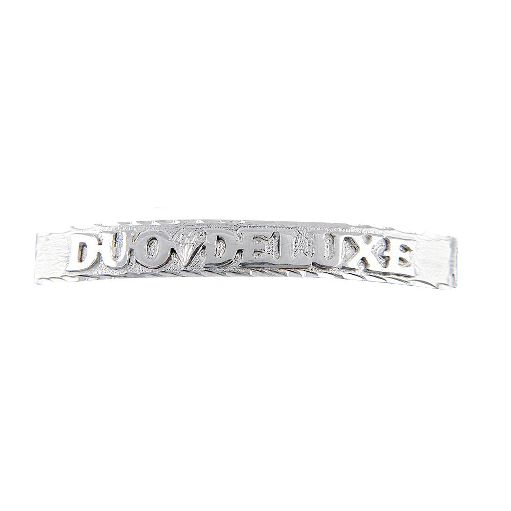 - Personalizamos su esclava con grabado tipo láser sin costo, o letras resaltadas de plata, plata con baño de oro y oro de 10k con un costo extra. Solo podemos personalizar su esclava con 10 caracteres. Puede configurar la opción de grabado que guste al realizar la compra. También podemos grabar números y figuras, para grabar figuras contáctenos por medio de WhatsApp o Messenger, para proporcionarle una cotización.